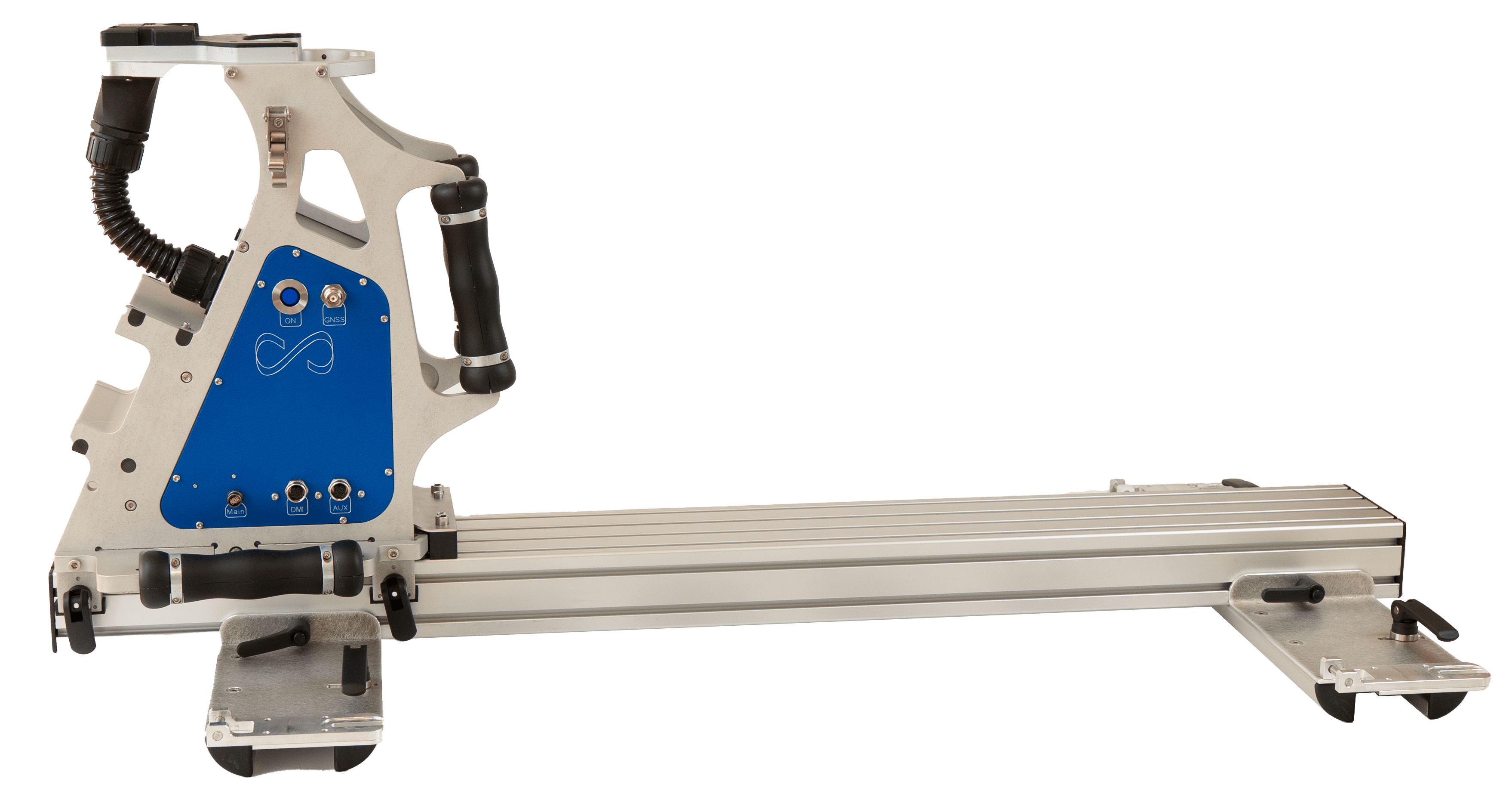 Fixé sur des barres de toit (non fournies), ce châssis en aluminium offre un point d’ancrage ultra-stable. Il assure une tenue impeccable du MS-96 tout en permettant d’embarquer des capteurs auxiliaires essentiels dans les environnements difficiles : seconde antenne GNSS (TNC) pour les relevés à faible vitesse, un odomètre (M12 8 pins) pour sécuriser la trajectoire lorsque le GNSS décroche, et un port AUX M12 destiné au PPS/NMEA.